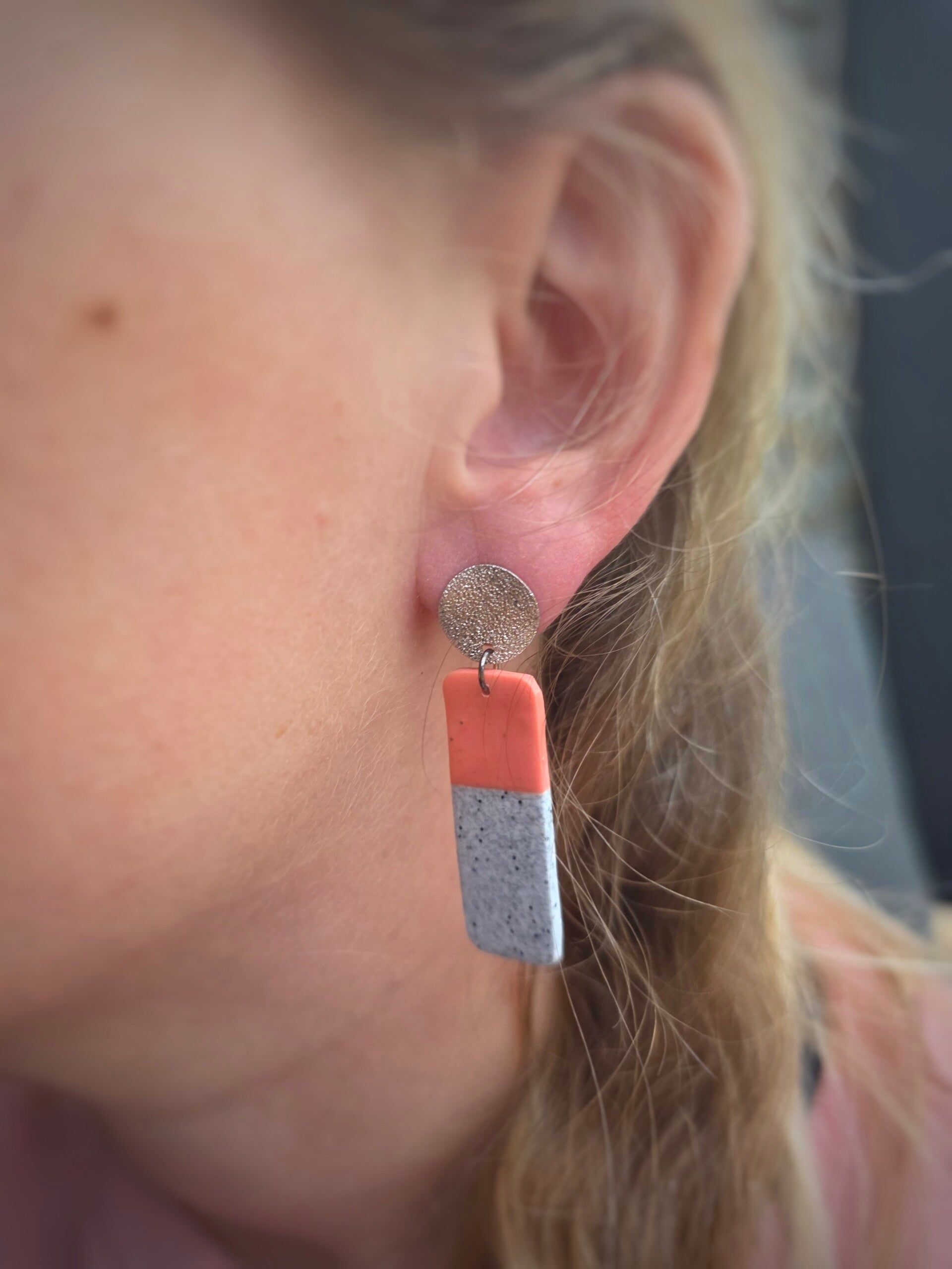 Handgemaakte roos met witgespikkelde oorbellen met zilverkleurige oorstekers. Lichtgewicht, gemaakt uit polymeerklei en afgewerkt met RVS materialen.