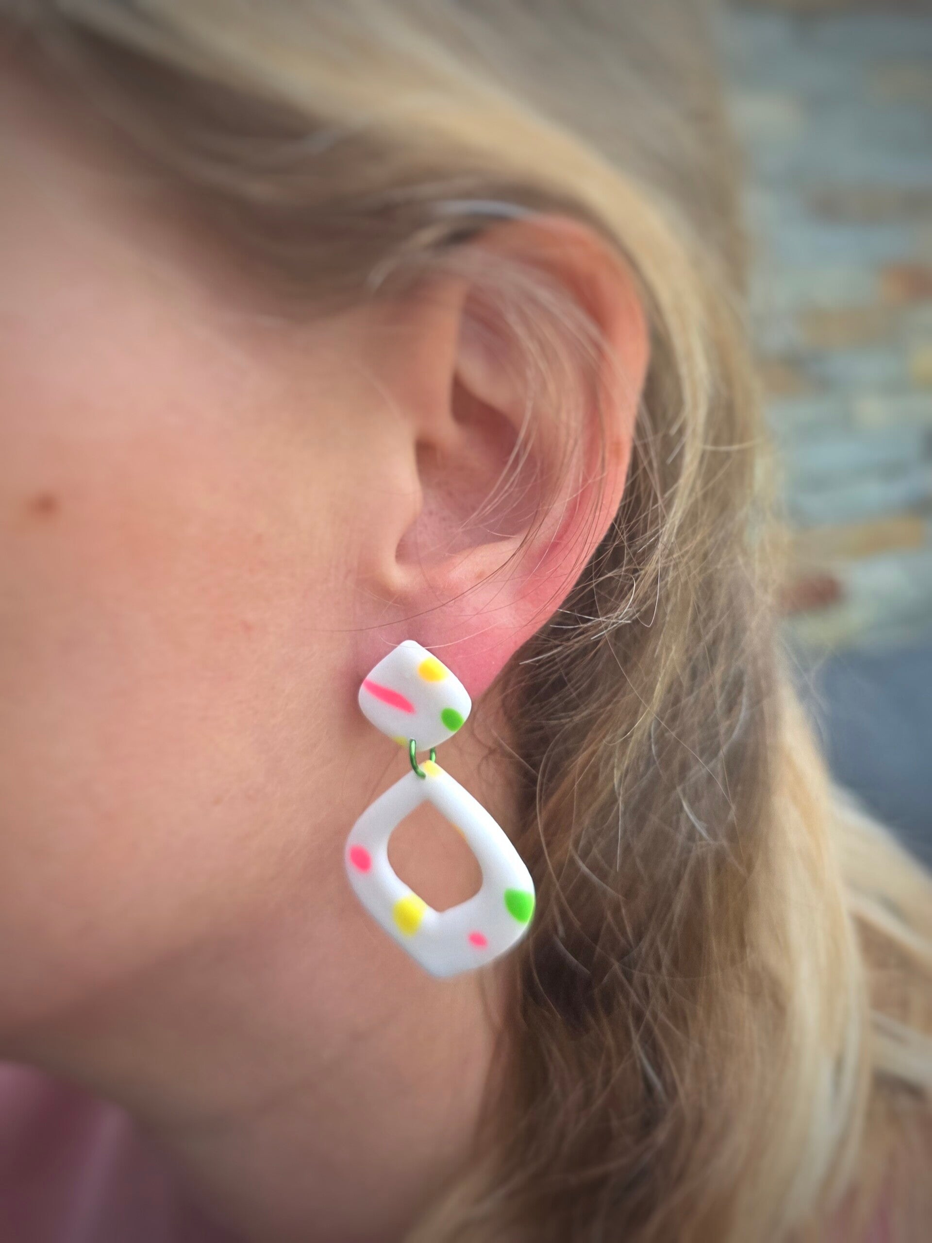 Handgemaakte wit gespikkelde oorbellen, lichtgewicht, gemaakt uit polymeerklei en afgewerkt met RVS materialen.