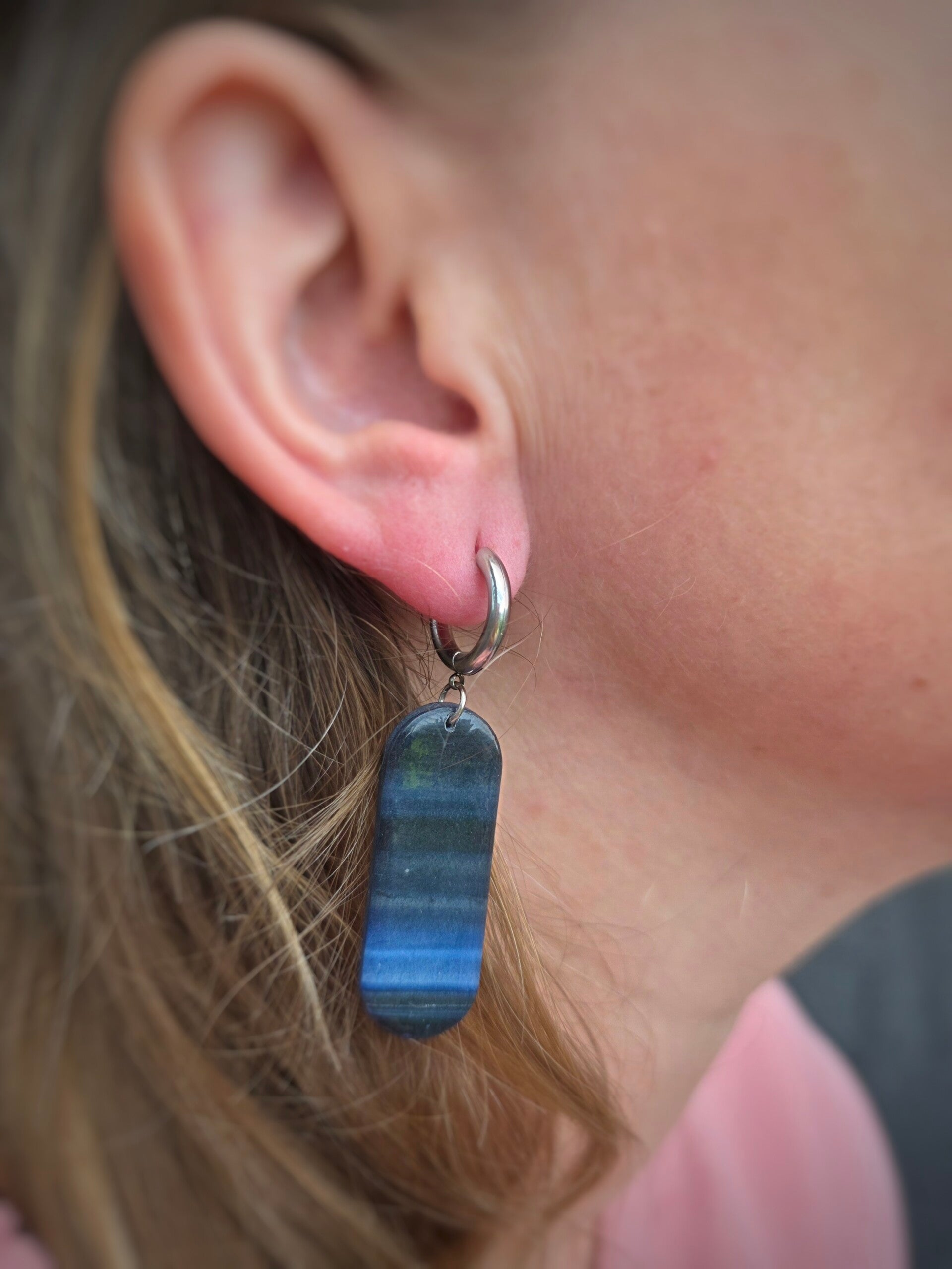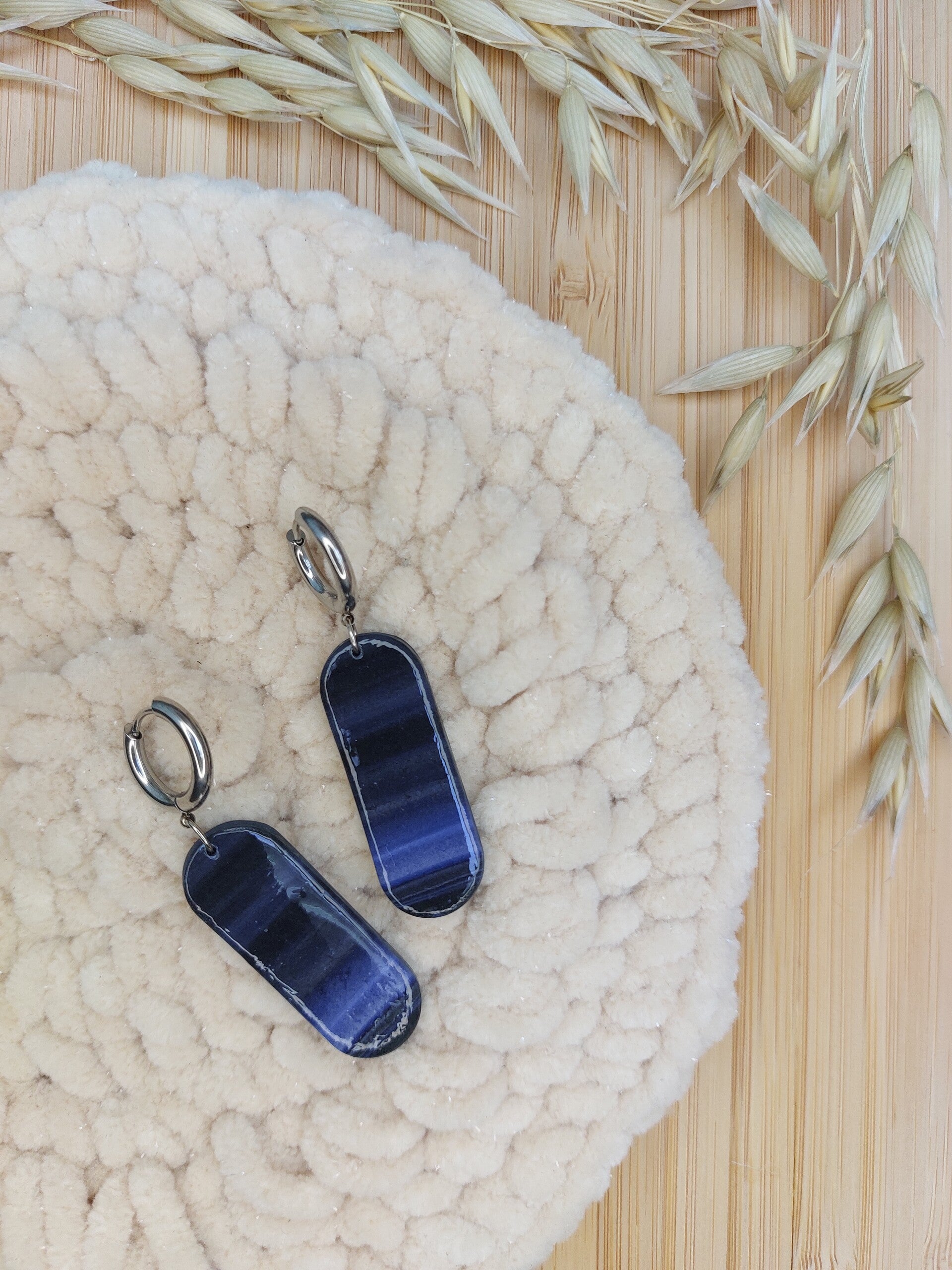 Handgemaakte donkerblauwe oorbellen met ringetje. Lichtgewicht, gemaakt van polymeerklei en afgewerkt met RVS materialen.