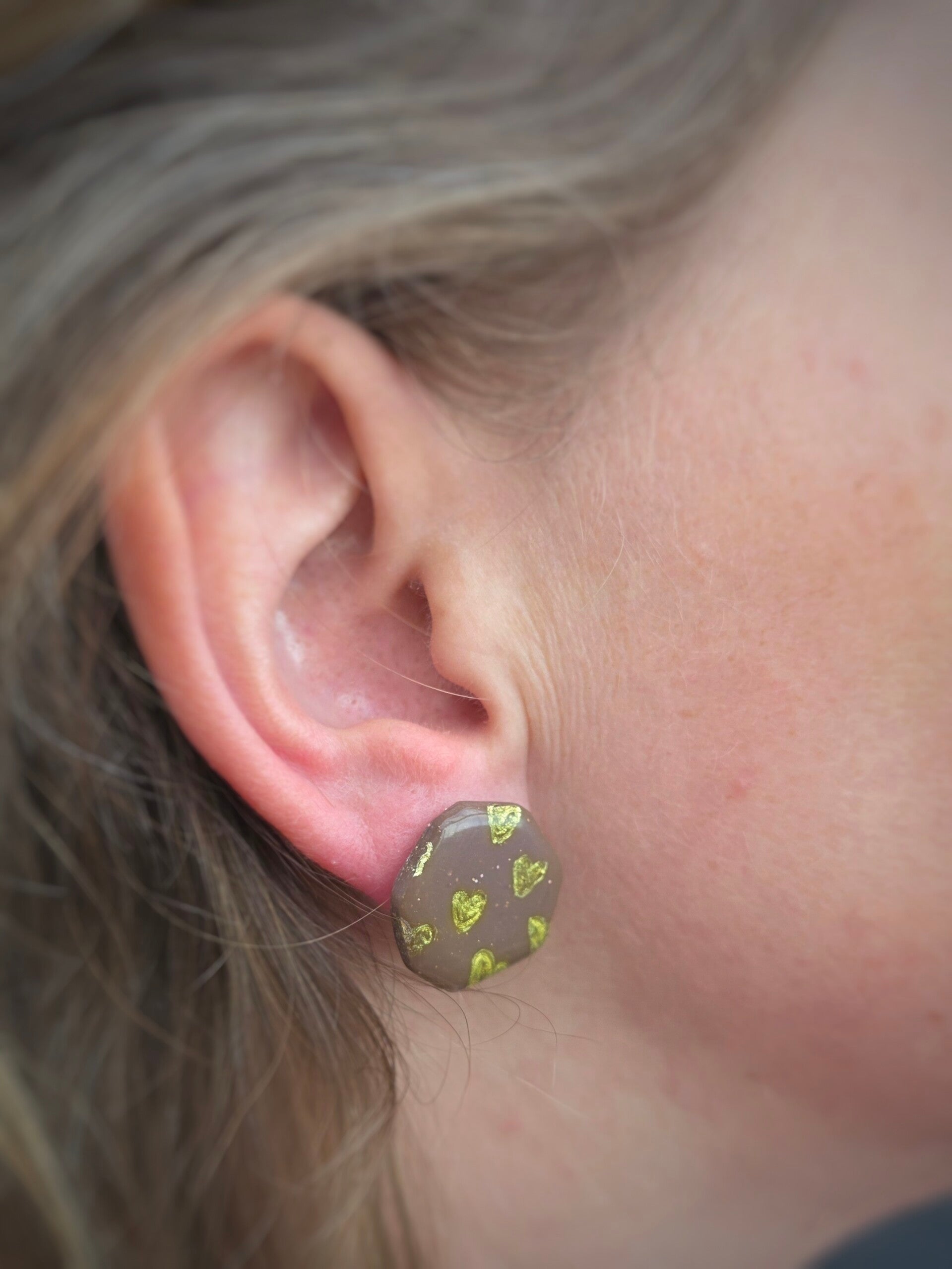 Handgemaakte bruine oorstekers met gouden hartjes. Lichtgewicht, gemaakt van polymeerklei en afgewerkt met RVS materialen.