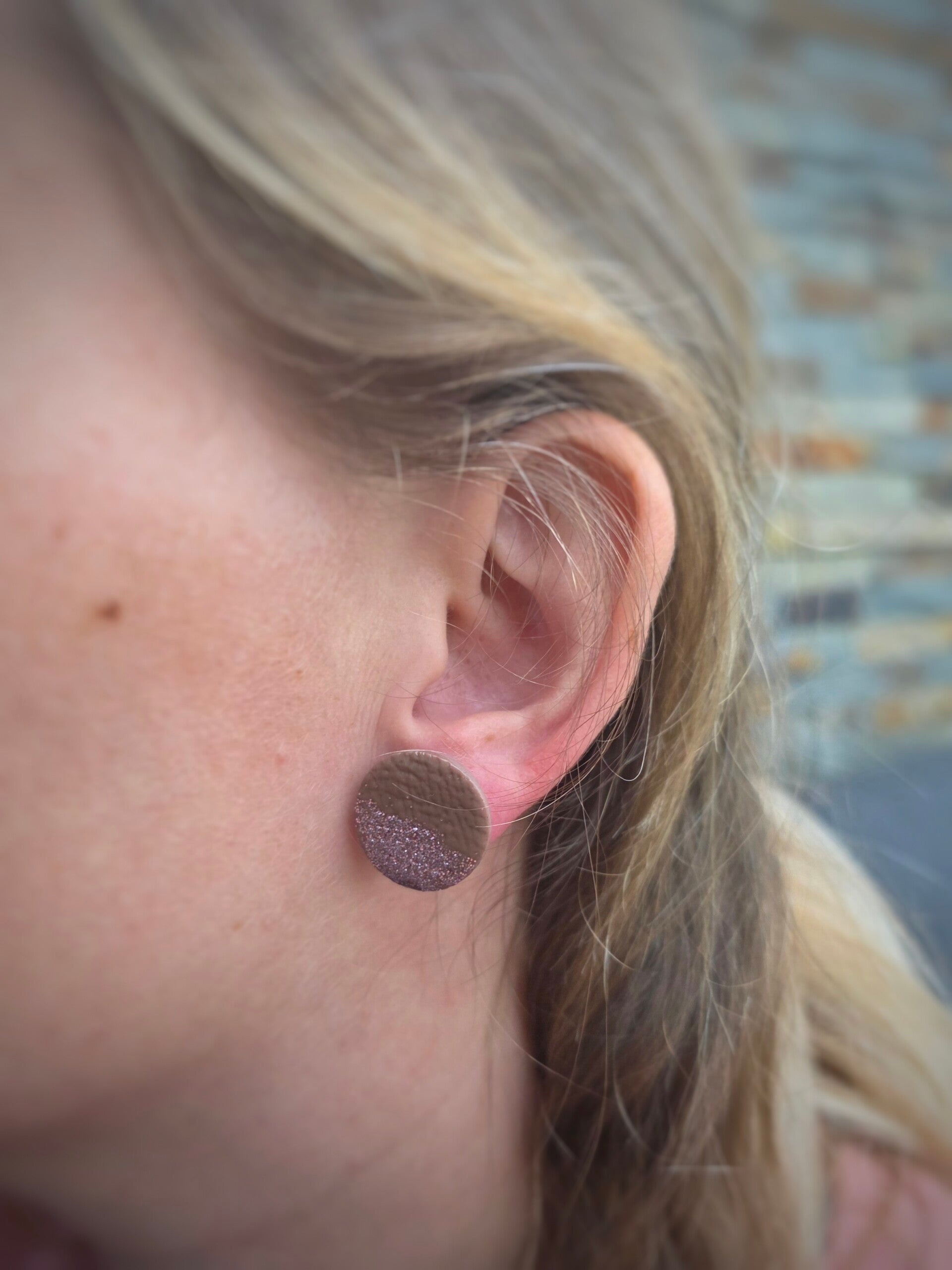 Handgemaakte grote bruine ronde oorstekers met glitter. Lichtgewicht, gemaakt van polymeerklei en afgewerkt met RVS materialen.
