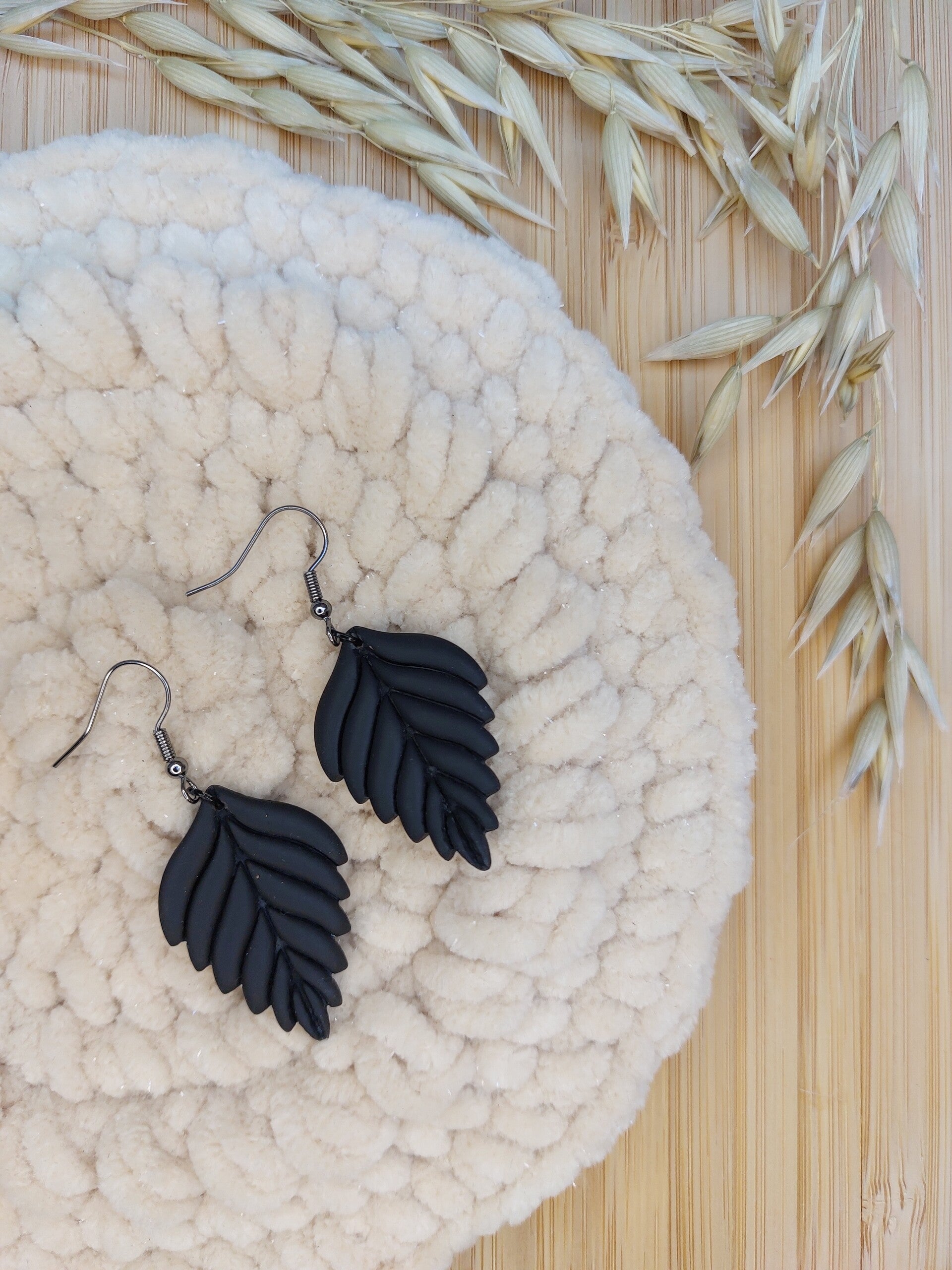 Handgemaakte zwarte blaadjes oorbellen. Lichtgewicht, gemaakt van polymeerklei en afgewerkt met RVS materialen.