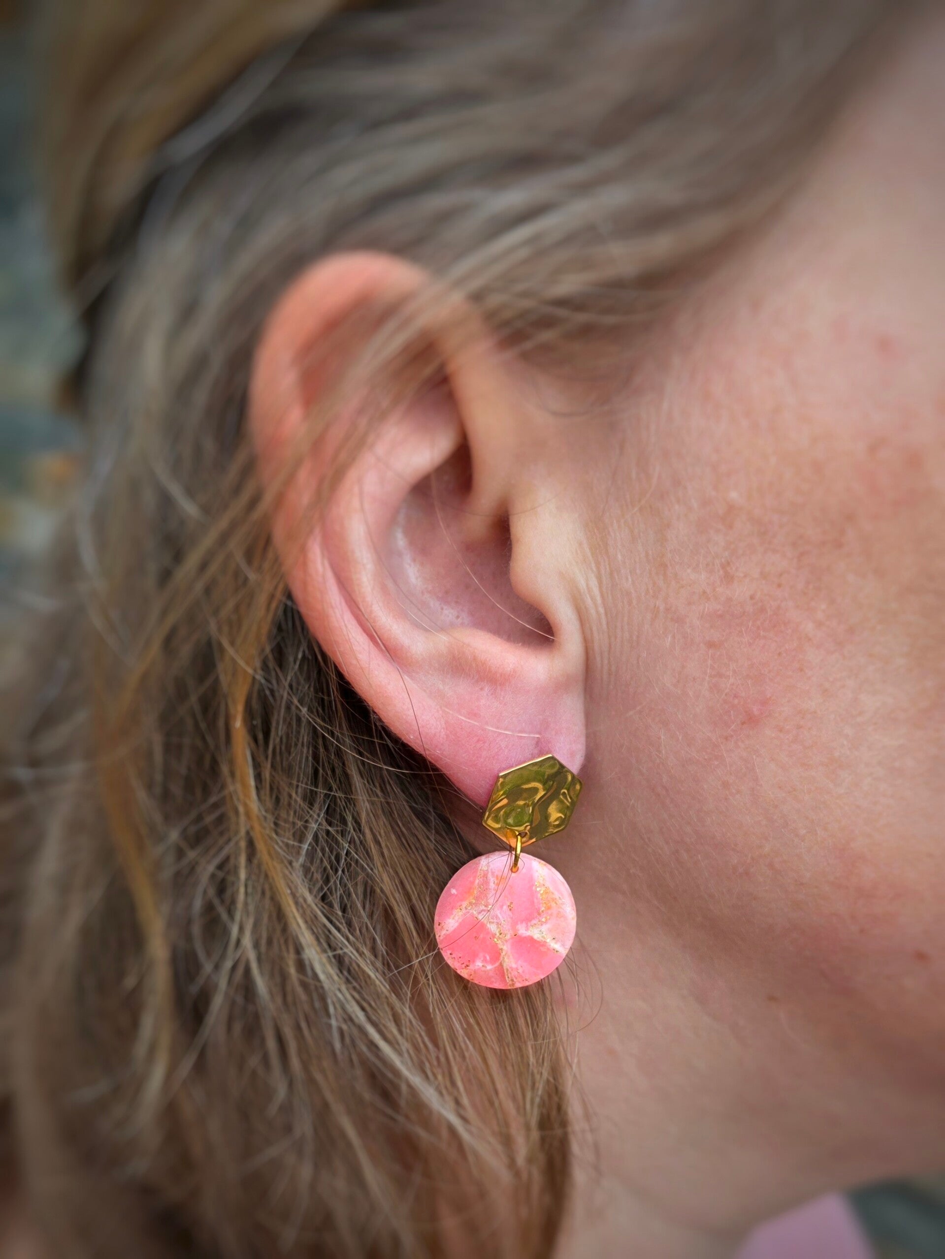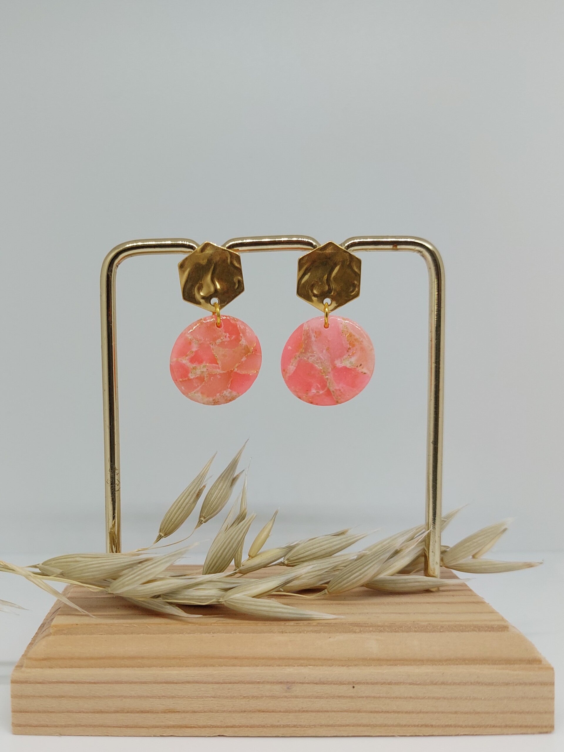 roze oorbellen met goudkleurige steker, handgemaakt uit polymeerklei en afgewerkt met RVS materialen.