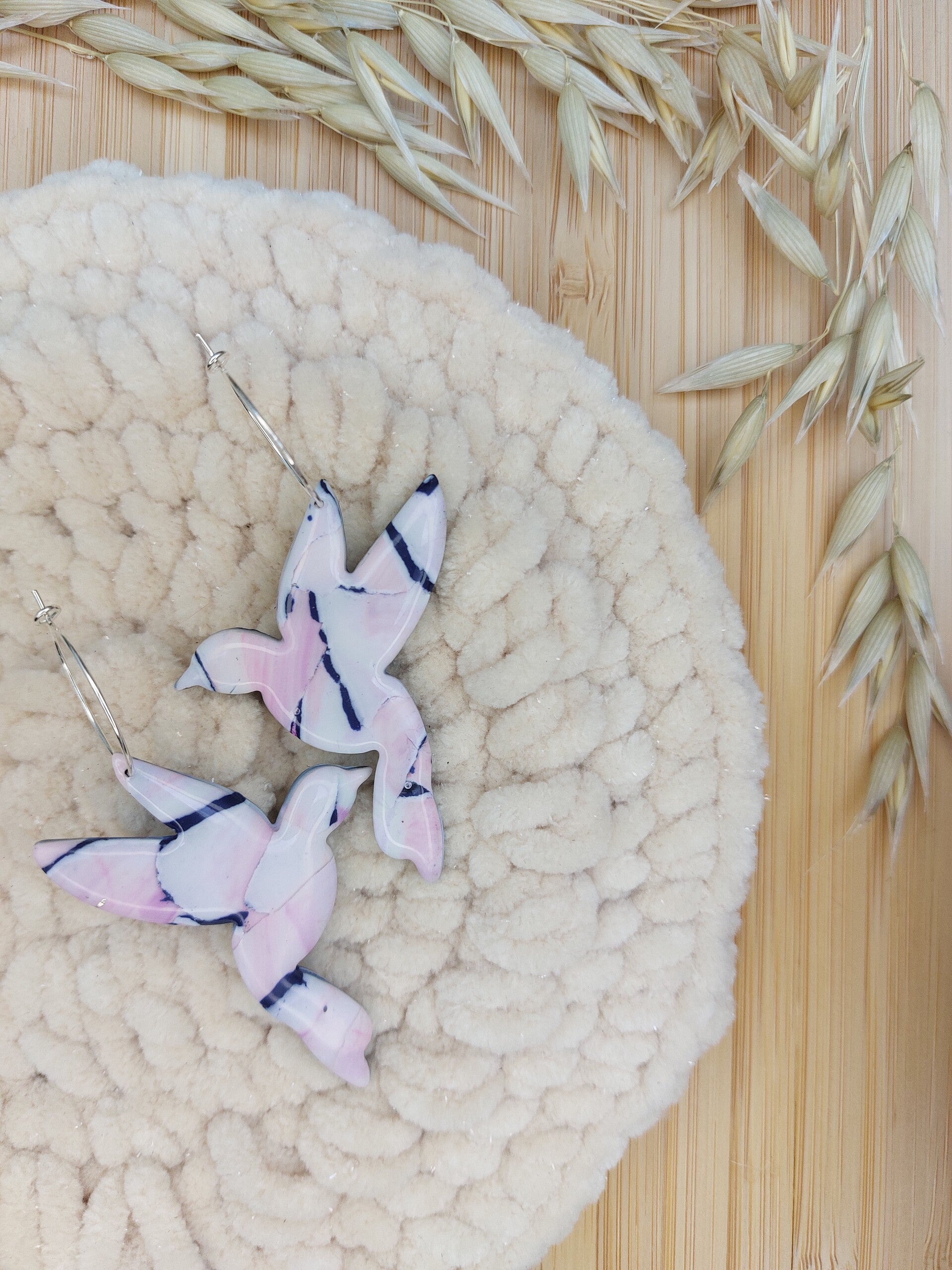 Gemamerde vogeloorbellen, handgemaakt uit polymeerklei en afgewerkt met RVS materialen.