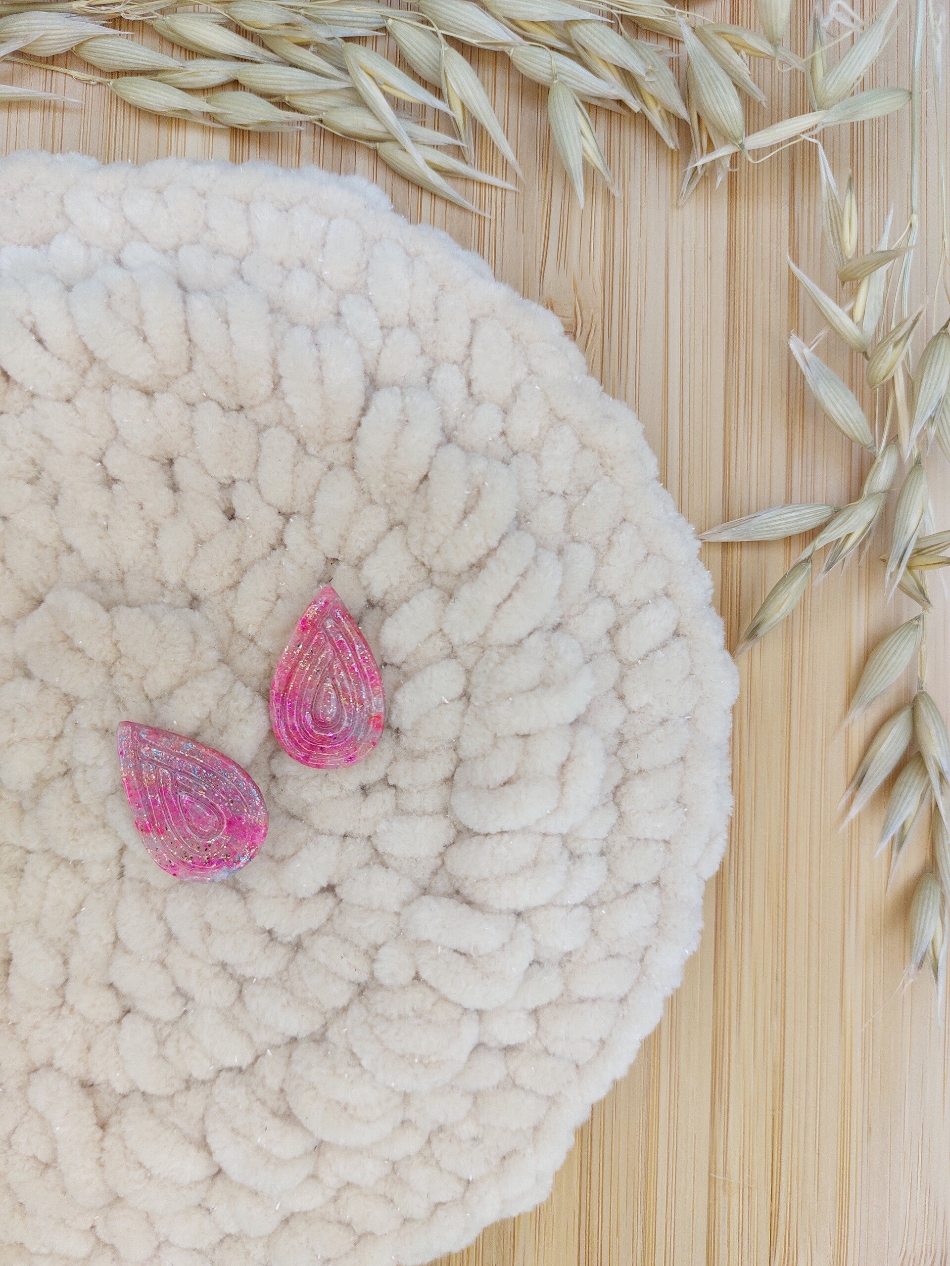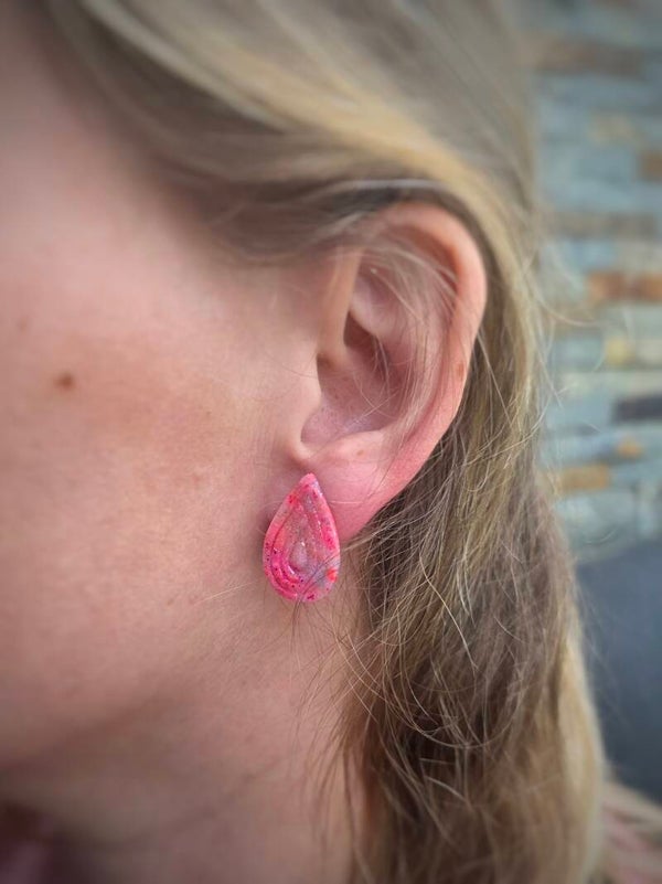 roze druppel oorbel, handgemaakt uit polymeerklei en afgewerkt met RVS materialen.