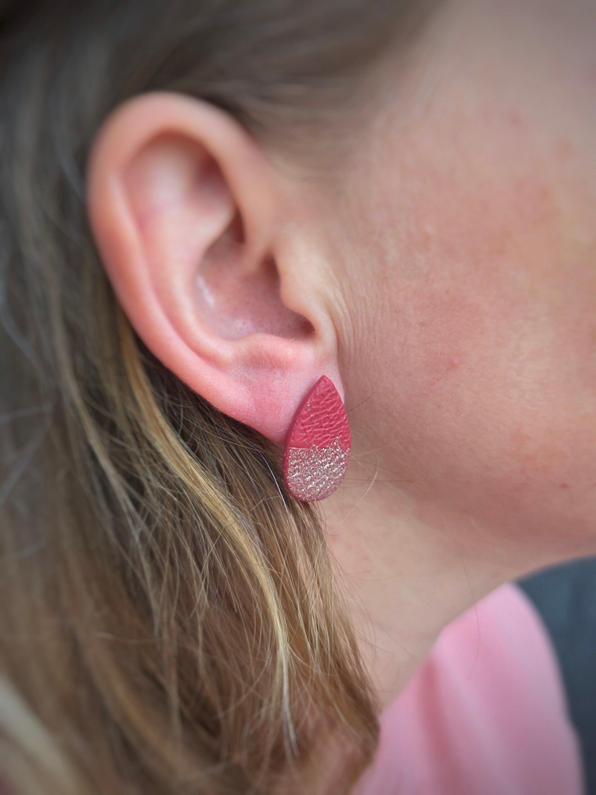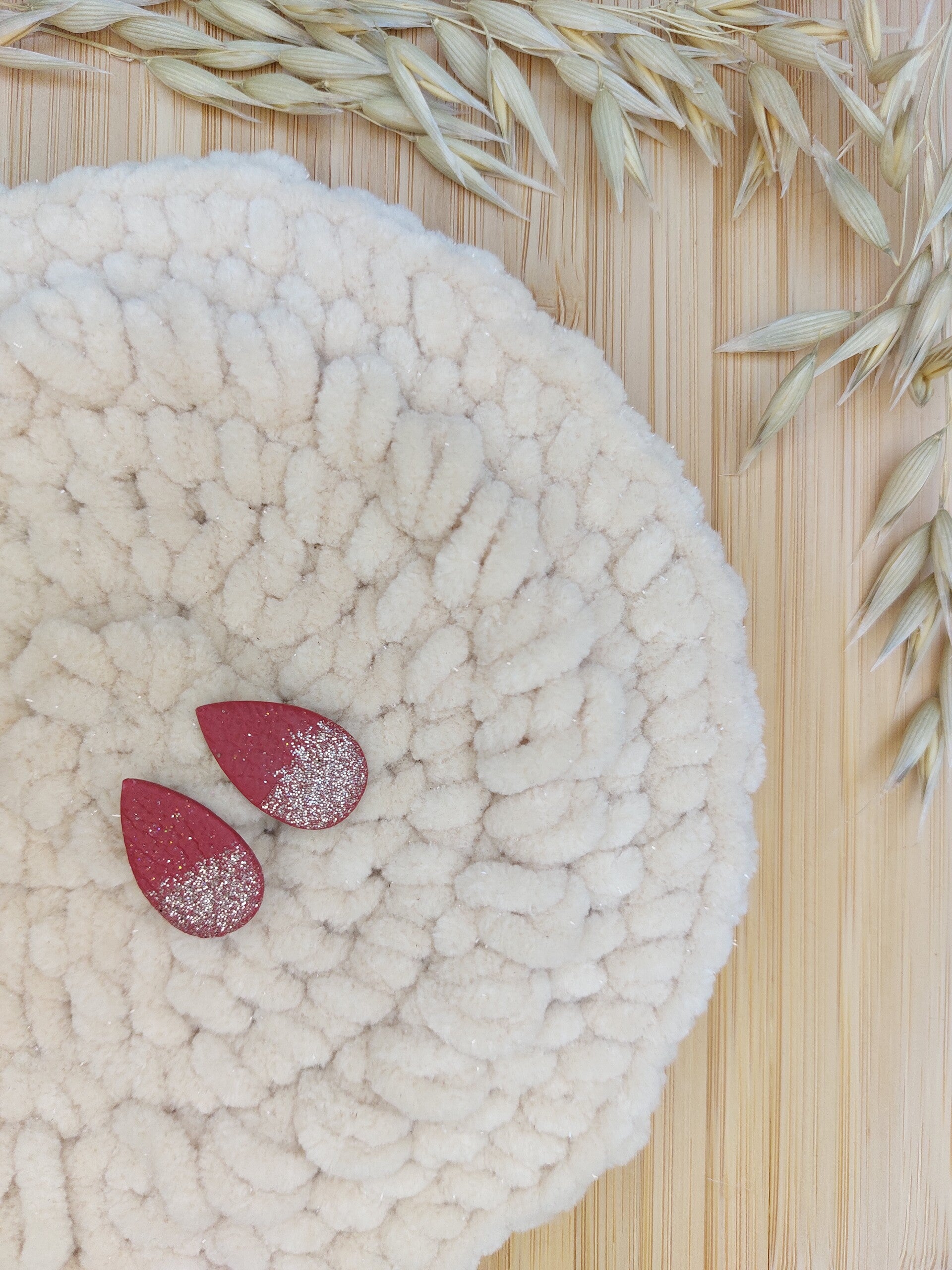 bordeaux druppeloorbel met glitter, handgemaakt uit polymeerklei en afgewerkt met RVS materialen.