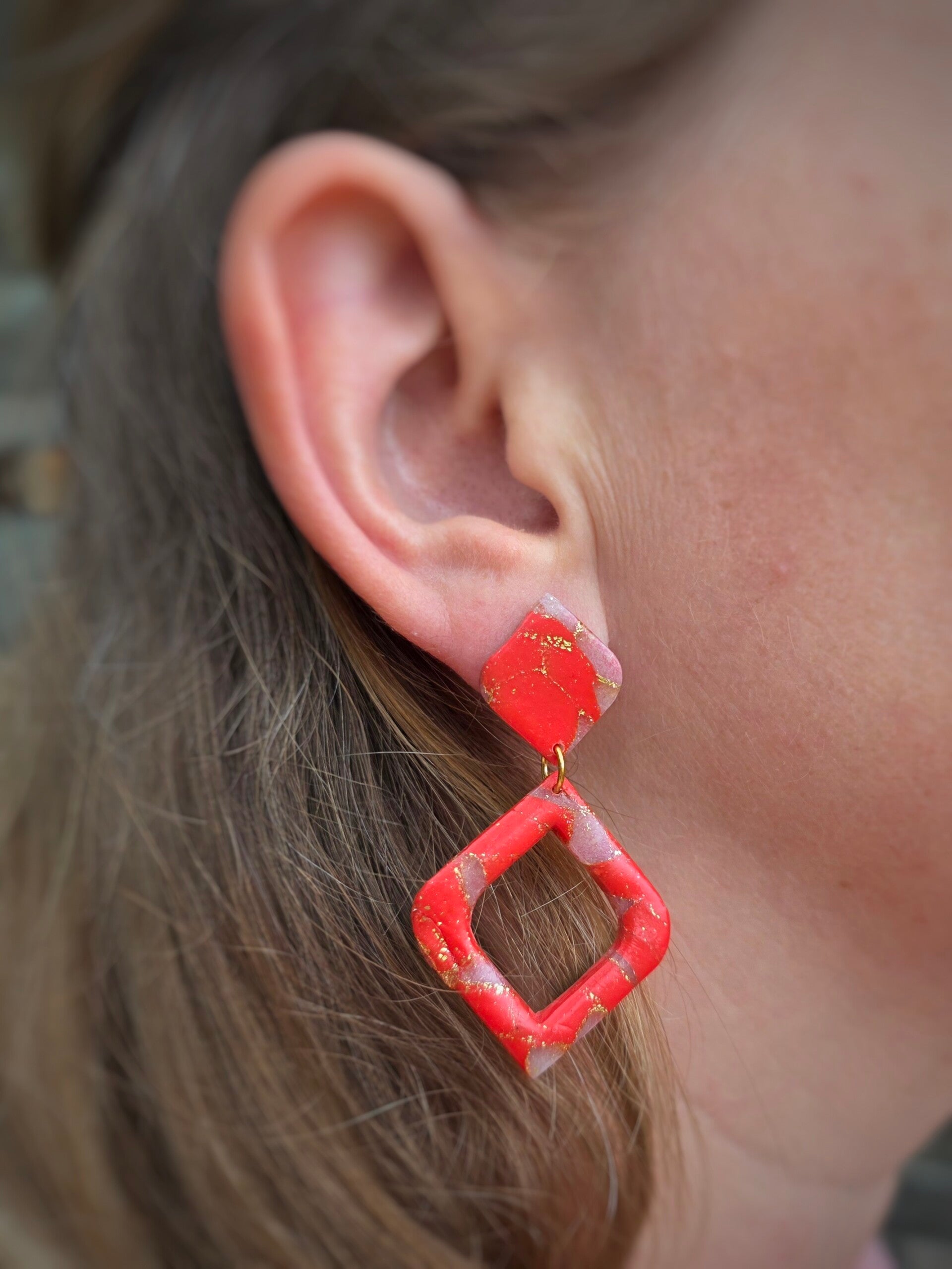 Rood gemarmerde oorbellen, handgemaakt uit polymeerklei en afgewerkt met RVS materialen