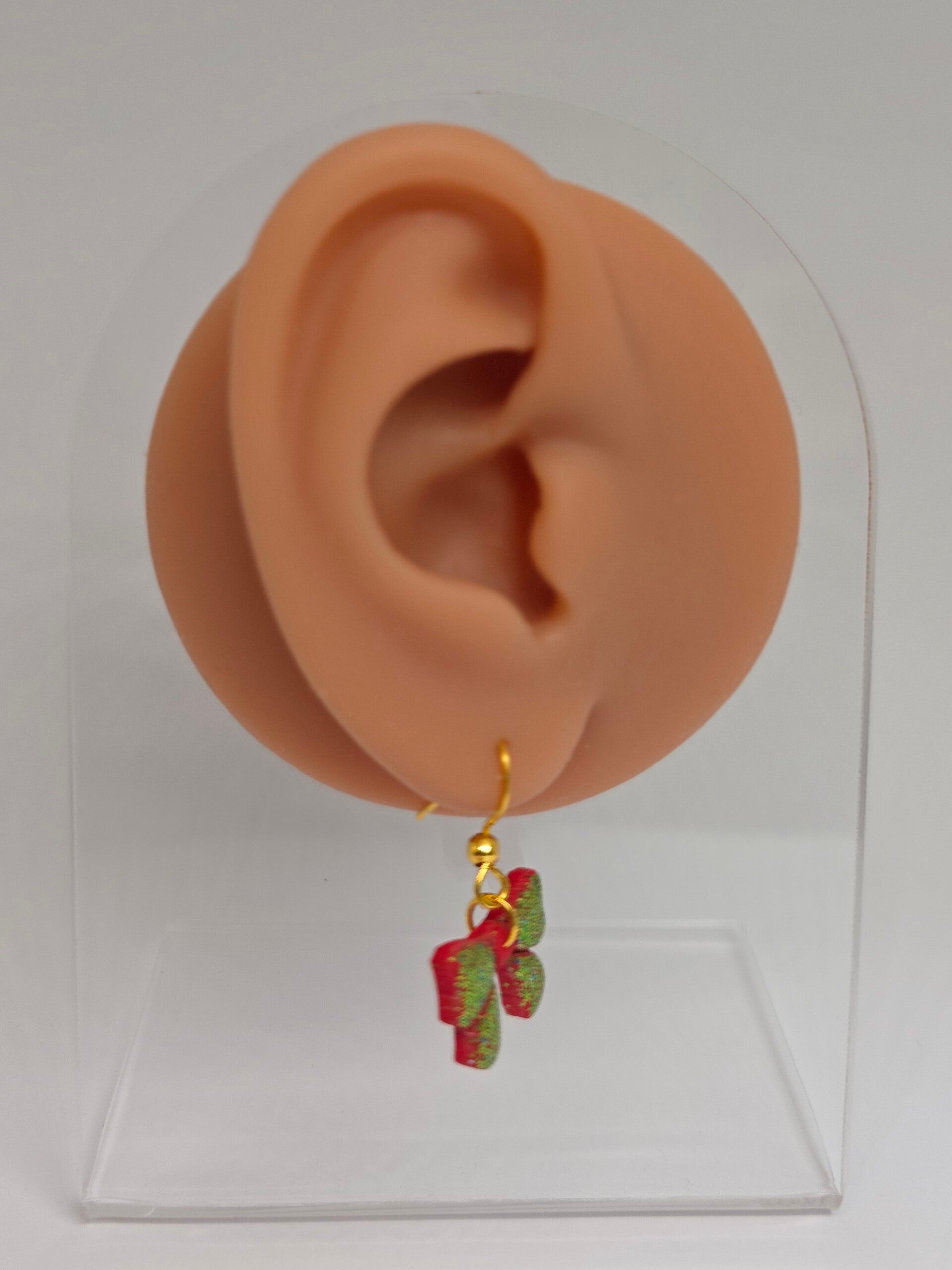 Rood strikje met groene glitter aan goudkleurige RVS oorhaakjes, kerst.