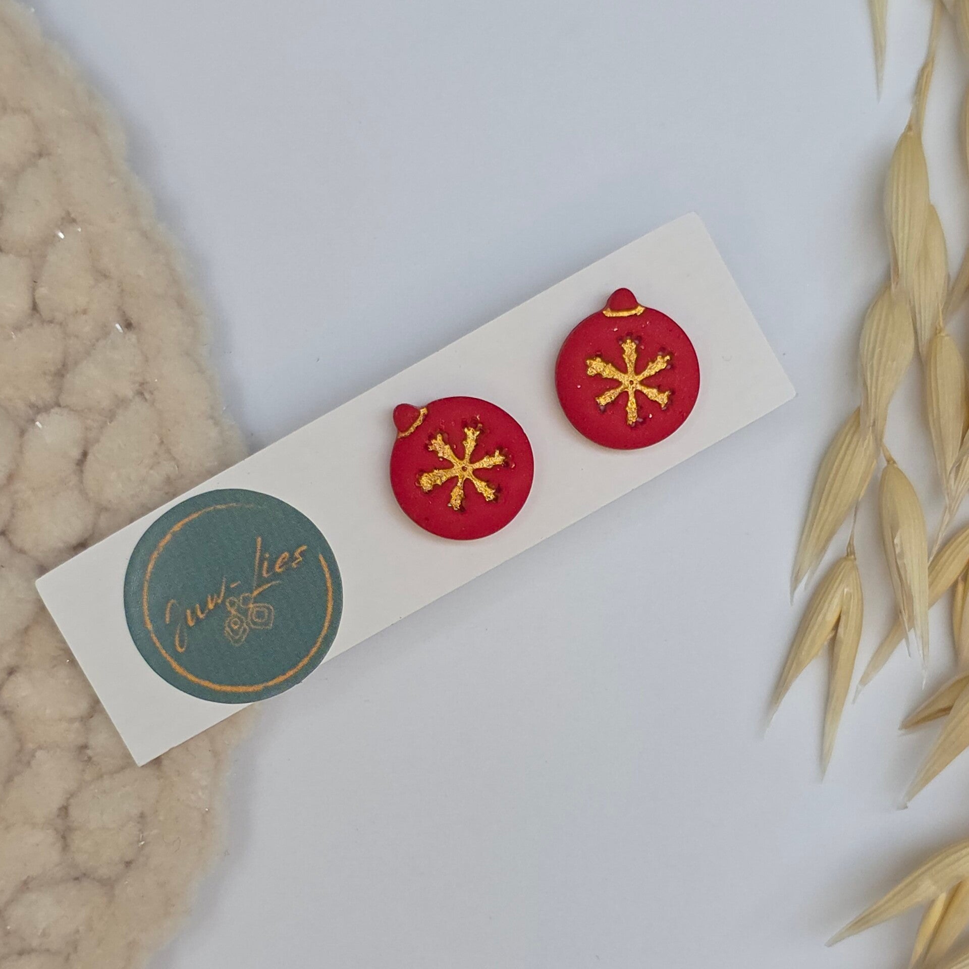 kerstbal oorstekers, rood met goud.