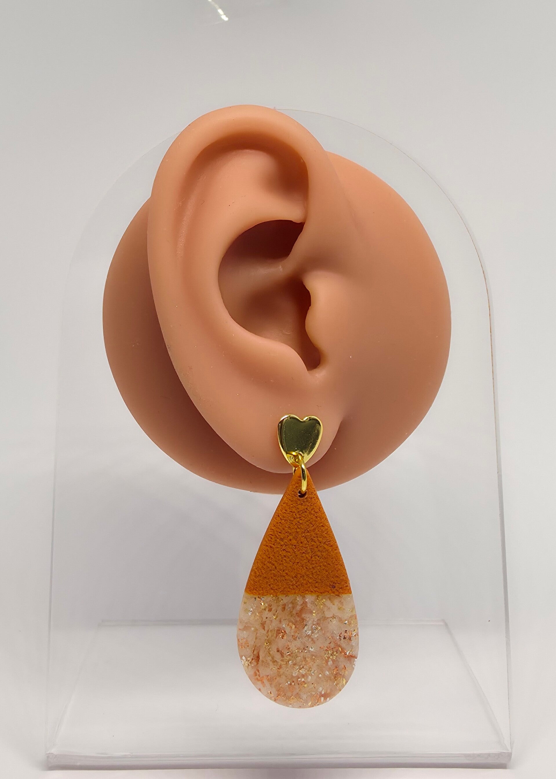 Roestbruine druppeloorbellen met glitter en RVS hartjes oorsteker.