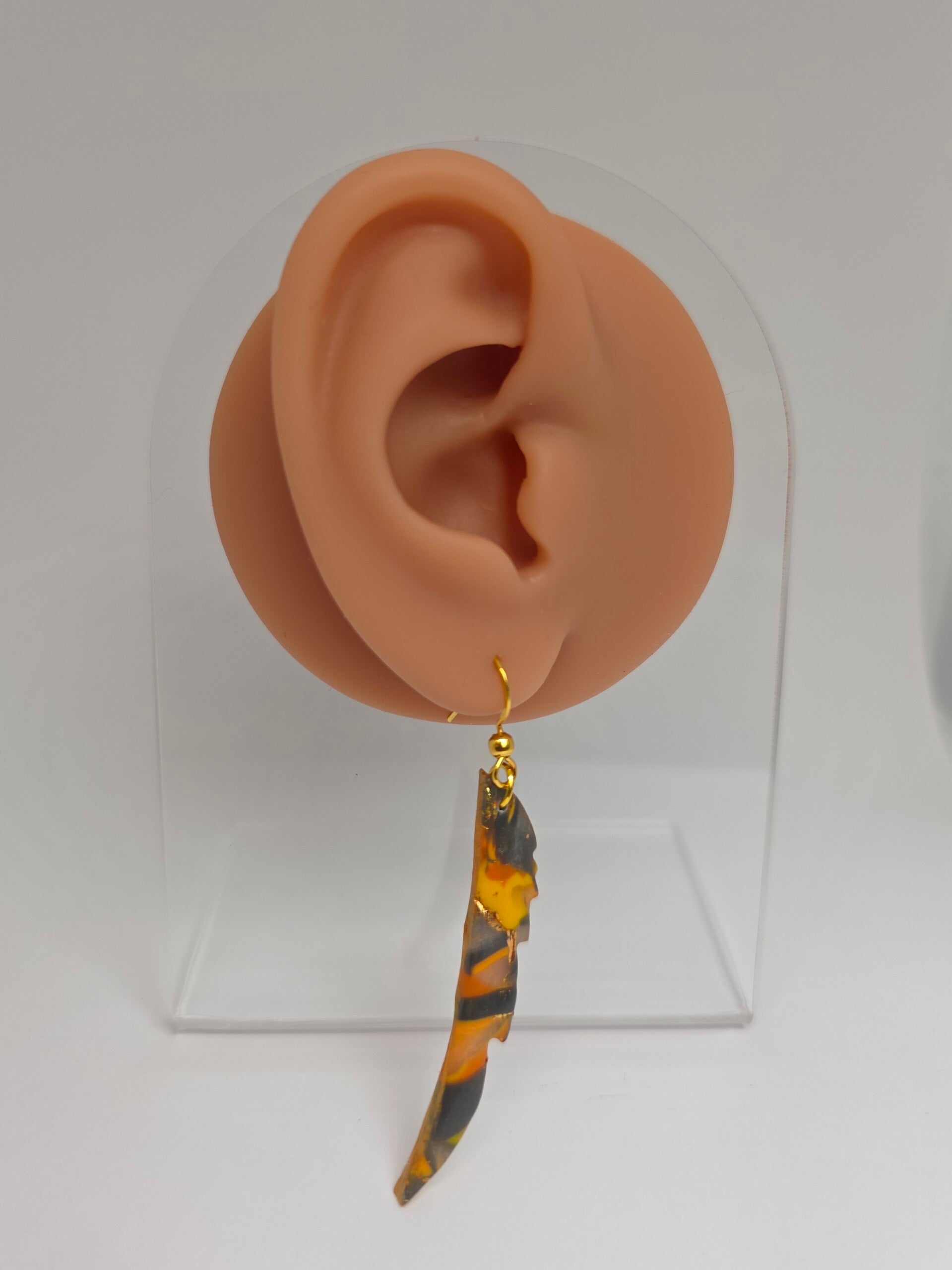 Halve veren oorbellen in herstkleuren aan goudkleurig RVS oorhaakje.