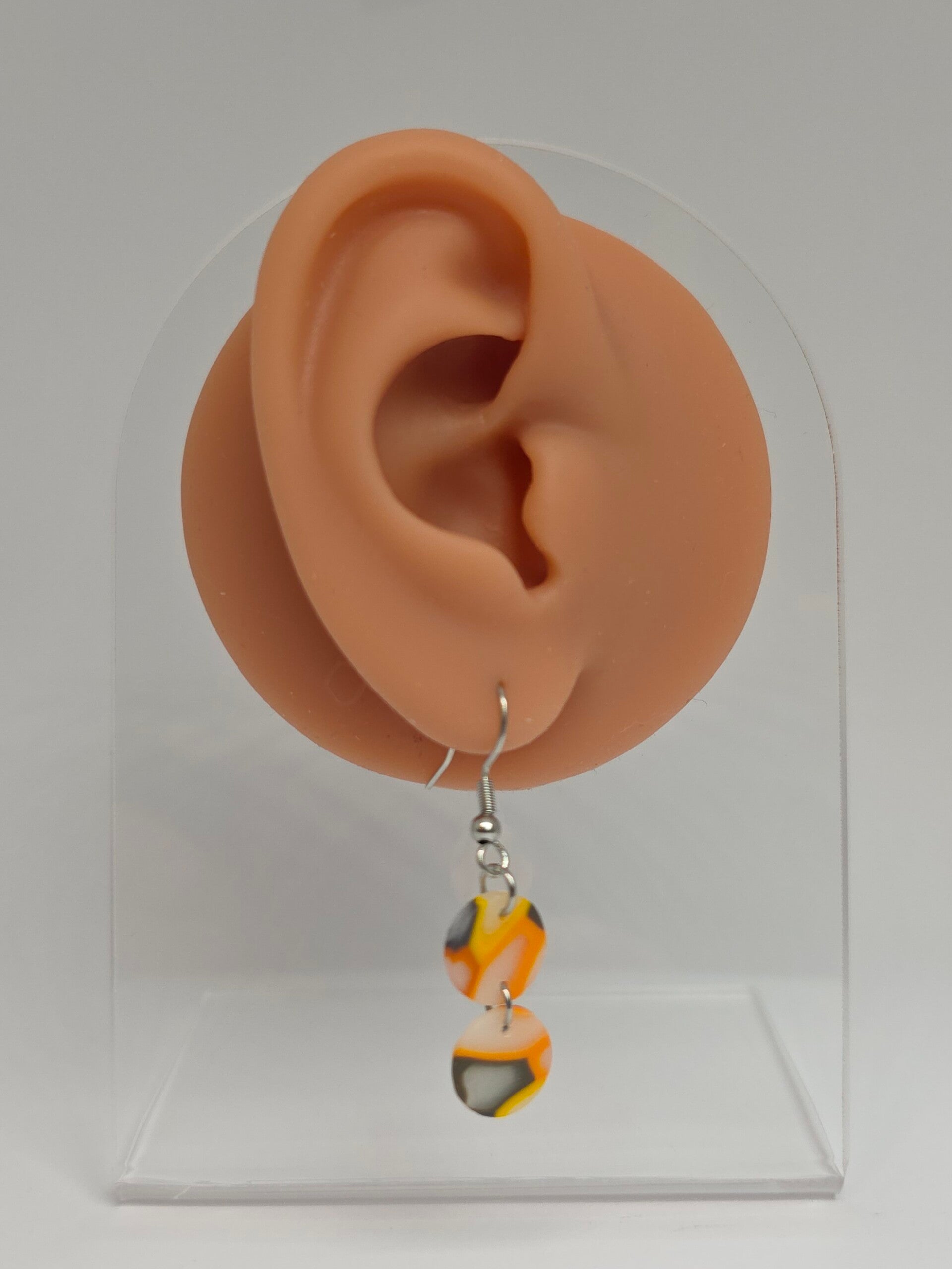 2 herfstkleurige rondjes aan zilverkleurige RVS oorhaakjes.
