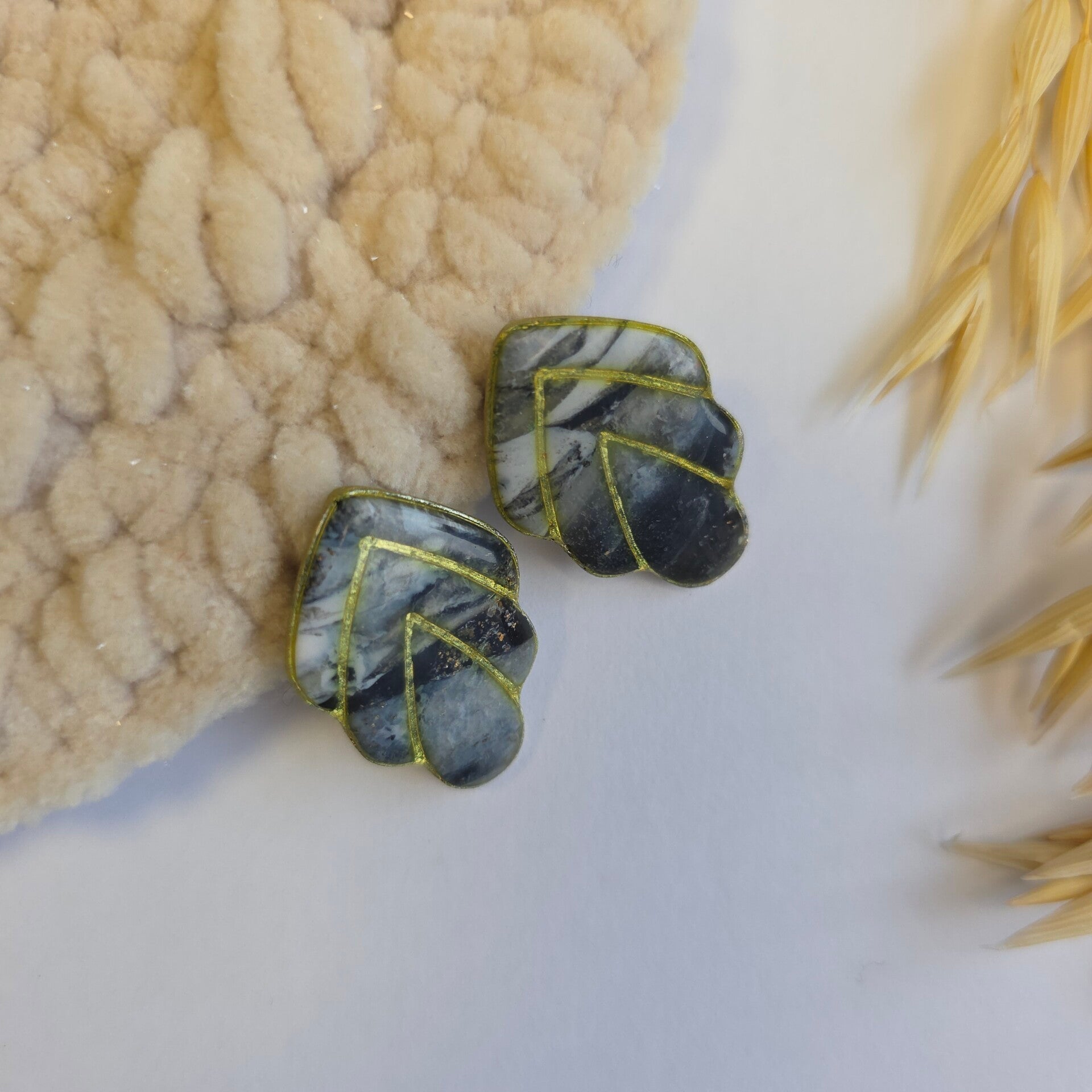 zwart gemarmerde oorbellen met gouden randje, handgemaakt uit polymeerklei en afgewerkt met rvs materialen.
