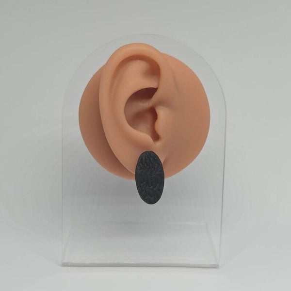 stijlvolle zwarte oorstekers met reliëf, handgemaakt uit polymeerklei en afgewerkt met rvs materialen.