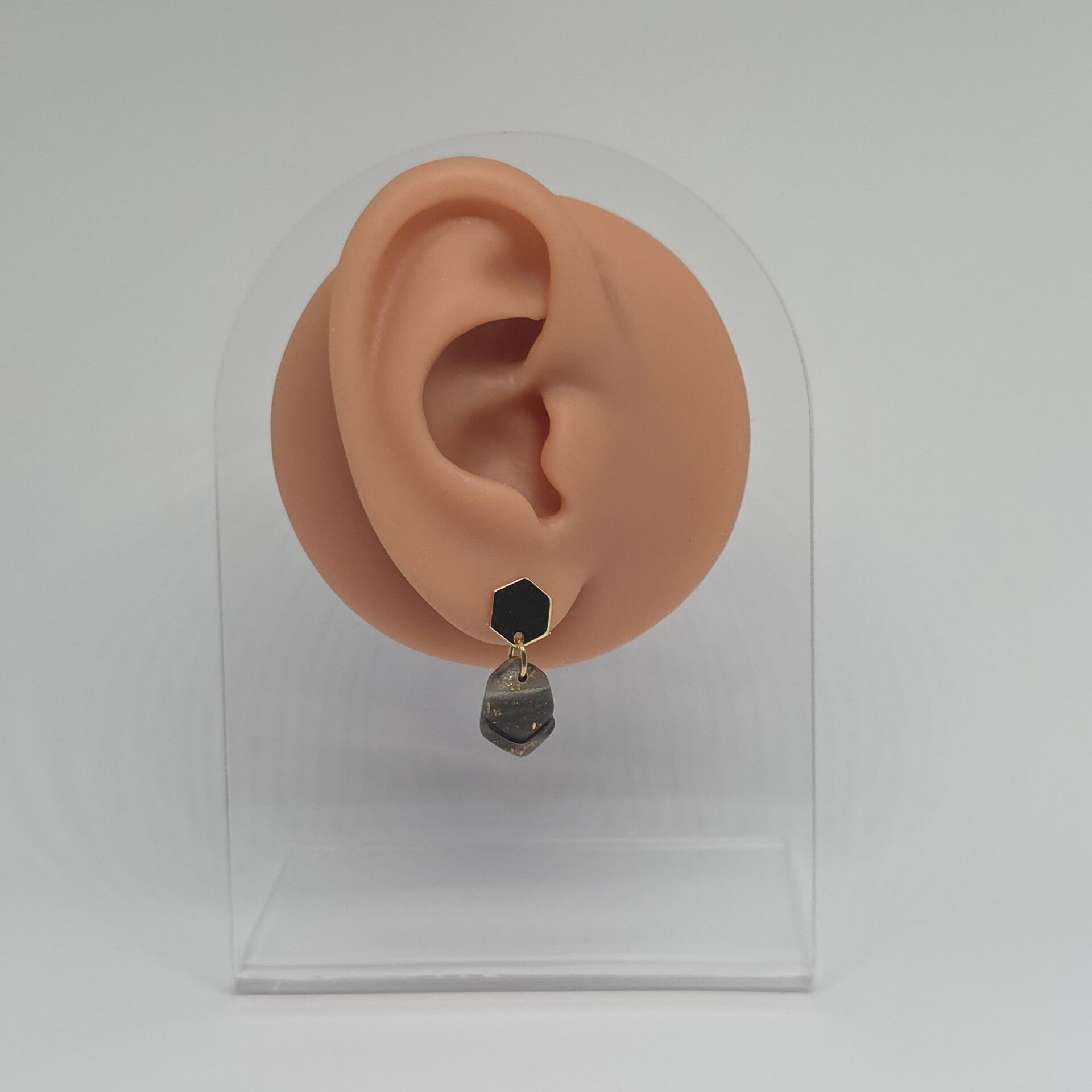 Elegante oorbellen, bruin gemarmerd, handgemaakt uit polymeerklei en afgewerkt met rvs materialen.