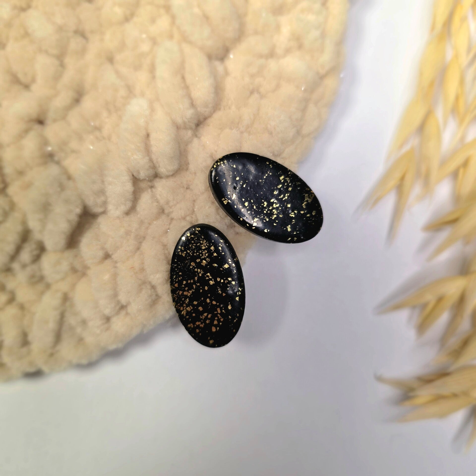 Glanzende zwarte oorstekers met gouden glitteraccenten, handgemaakt uit polymeerklei en afgewerkt met rvs materialen