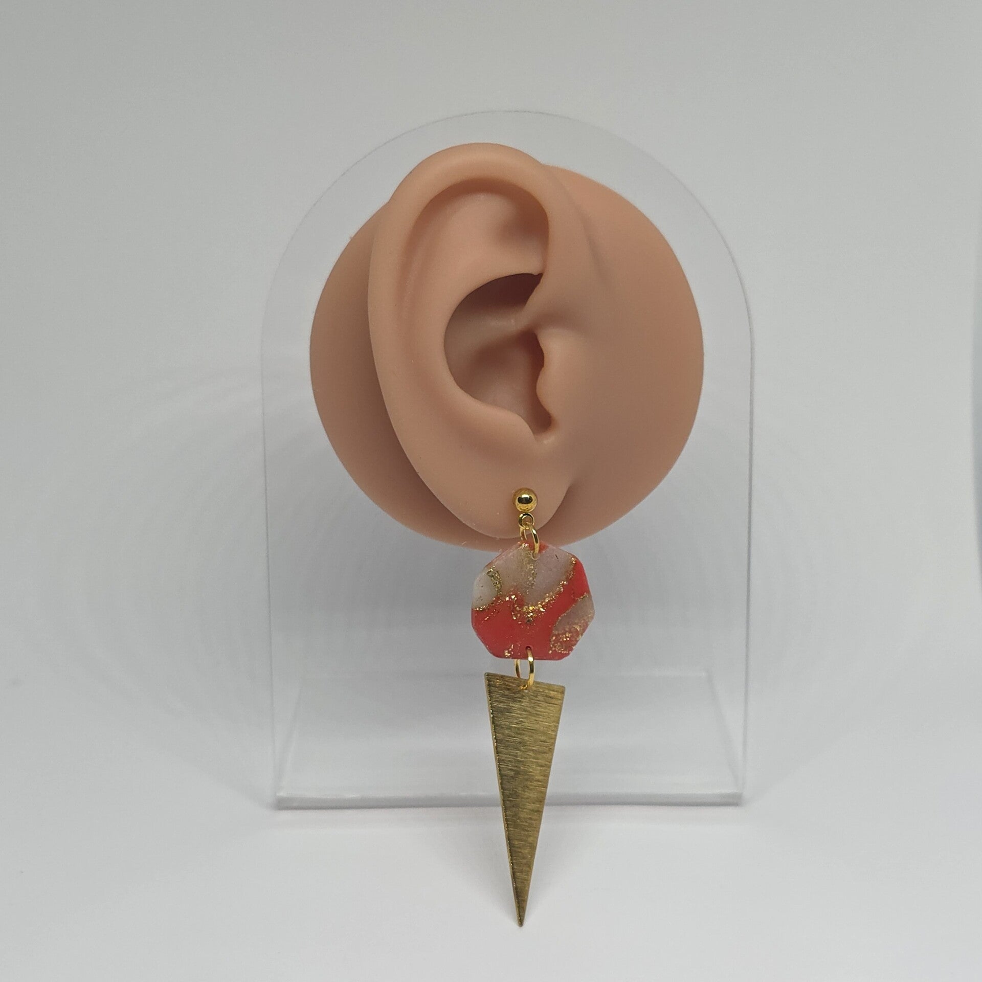 Lange rood met gouden oorbellen, gouden driehoeken.