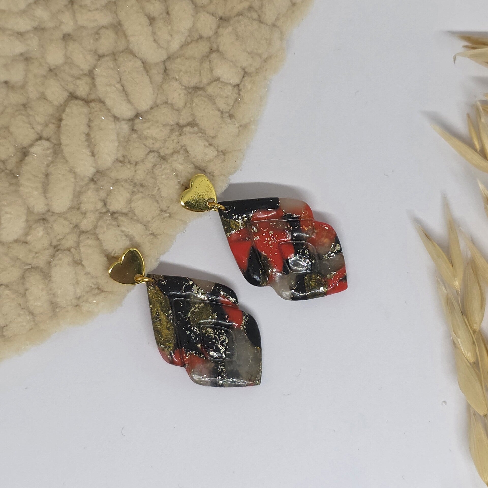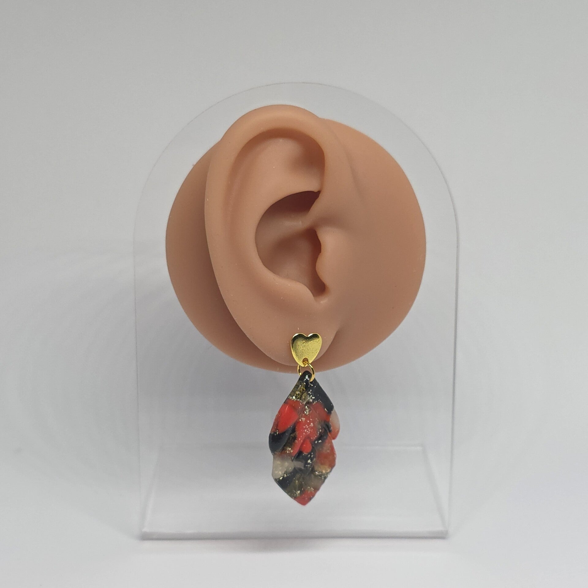 Elegante rood/zwart gemarmerde oorbellen met RVS hartjes oorsteker.